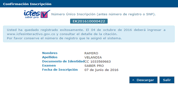- Al finalizar el registro la herramienta te genera un código llamado EK el cual confirma tu inscripción a las pruebas Saber Pro y TyT, por lo tanto es importante que lo conserves.